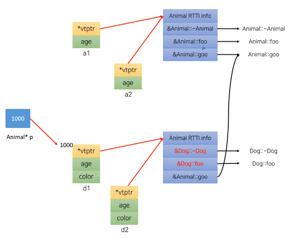 p->foo(); // 내부적으로 p->vtptr[?]() 호출